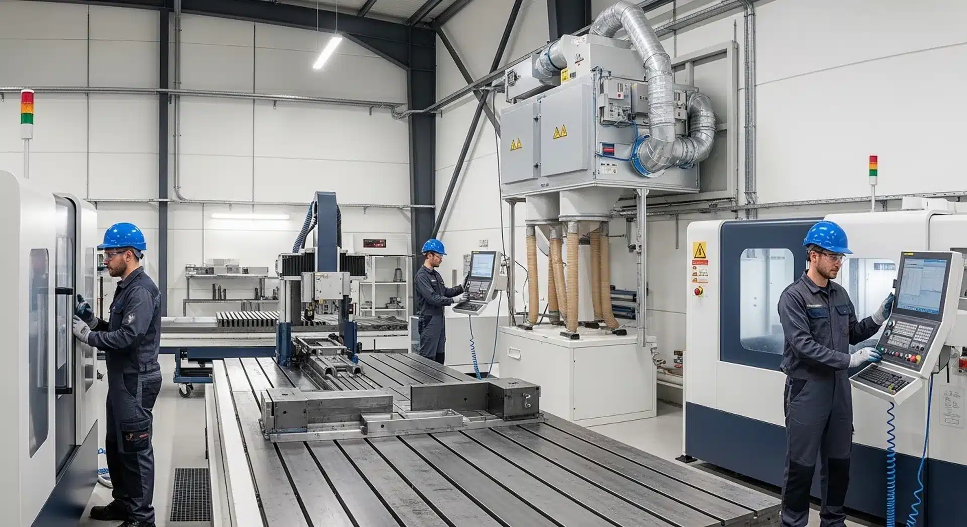 Instalamos campanas y brazos articulados en la fuente para capturar el polvo crítico antes de dispersarse totalmente.